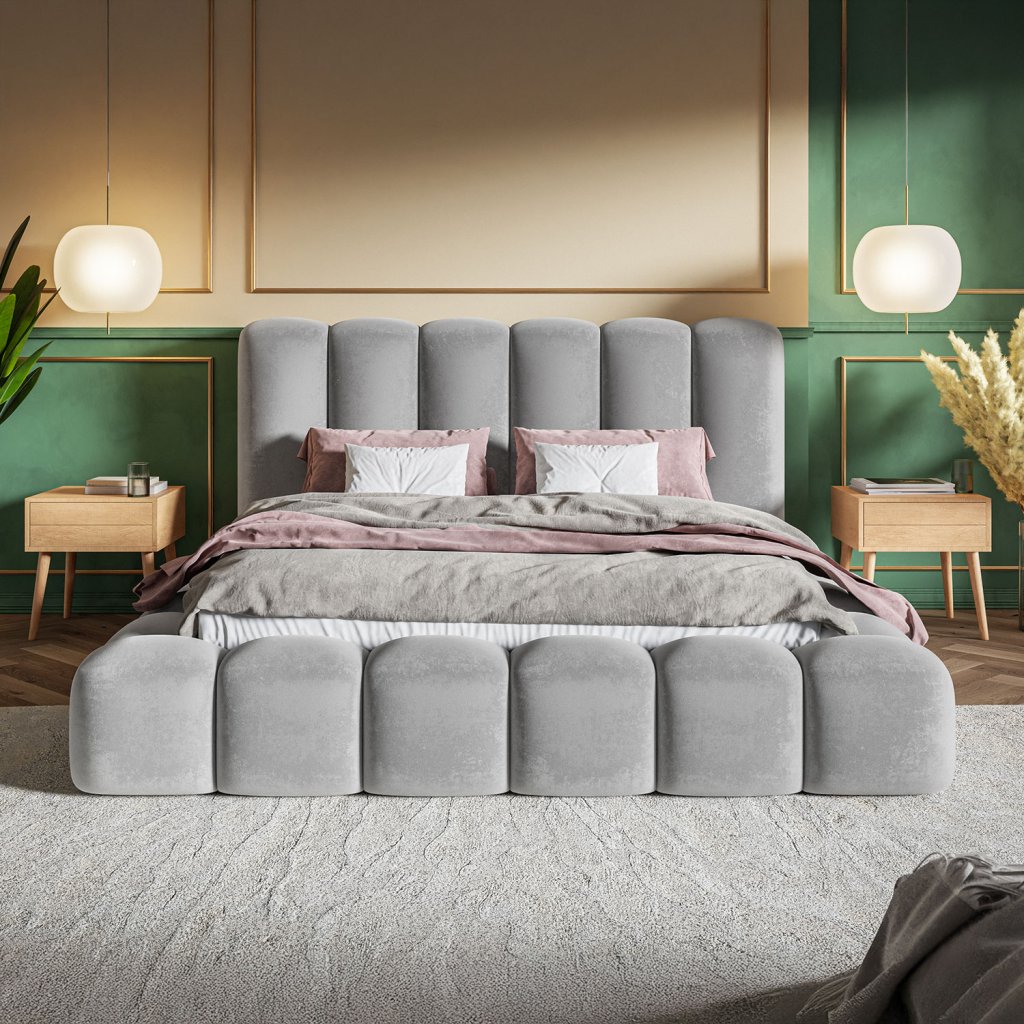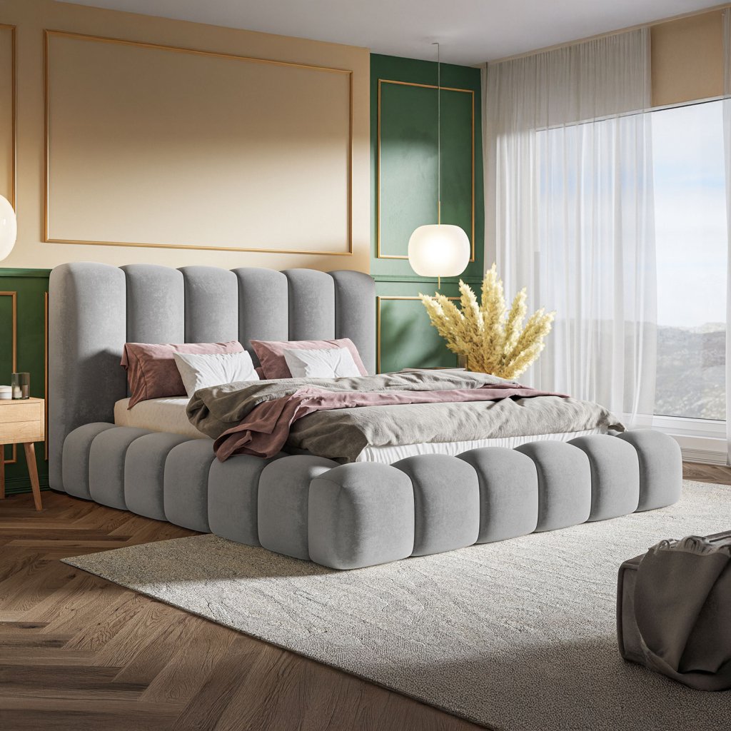 Dizajnová čalúnená posteľ ELEGANZA očarí svojimi ladnými líniami v rovnakom dizajne zo všetkých strán. Ponúka priestranný úložný priestor na posteľnú bielizeň, kvalitnú konštrukciu a výber roštu podľa preferencií.