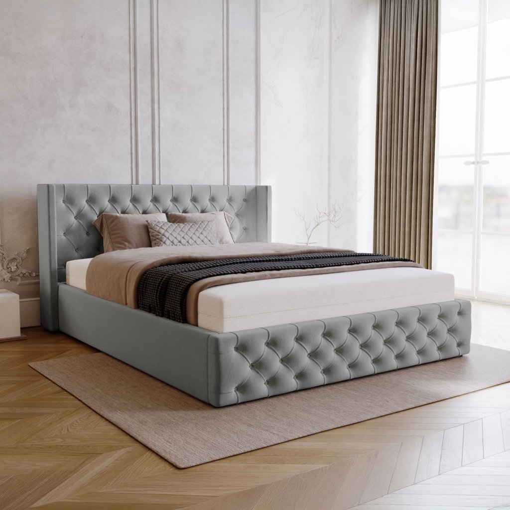 Elegantná čalúnená posteľ ESME v štýle chesterfield sa stane dominantou v spálni.