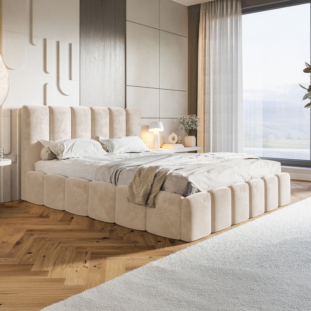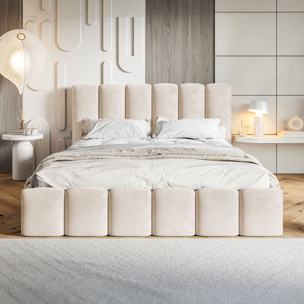 Dizajnová čalúnená posteľ EZRA je jedinečným kúskom pre moderné interiéry. Zaujme svojim netradičným, mäkkým čalúnením a oblinami, ktoré vnášajú do miestnosti hravosť a pohodlie. Vysoké čelo poskytuje dokonalú oporu, zatiaľ čo premyslený úložný priestor zabezpečuje praktické riešenie pre každodenné potreby. EZRA sa stane dominantným prvkom každej spálne a dodá jej výnimočný šmrnc.