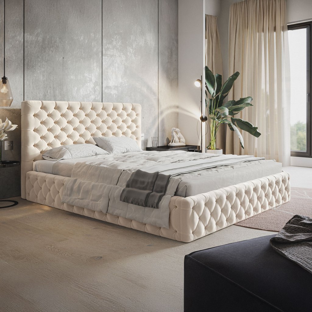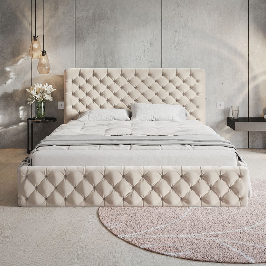Dizajnová čalúnená posteľ KERA je skutočným stelesnením elegancie a luxusu. Vyznačuje sa bohato prešívaným čelom a rámom v štýle chesterfield, ktorý dodáva priestoru výnimočný charakter. Jej symetrický a opulentný vzhľad pôsobí noblesne z každého uhla, čím sa stáva dominantou každej modernej spálne. Praktický úložný priestor poskytuje dostatok miesta na uskladnenie posteľnej bielizne, zatiaľ čo kvalitná konštrukcia zabezpečuje stabilitu a dlhú životnosť. Možnosť výberu roštu vám umožňuje prispôsobiť si posteľ podľa vlastných potrieb.