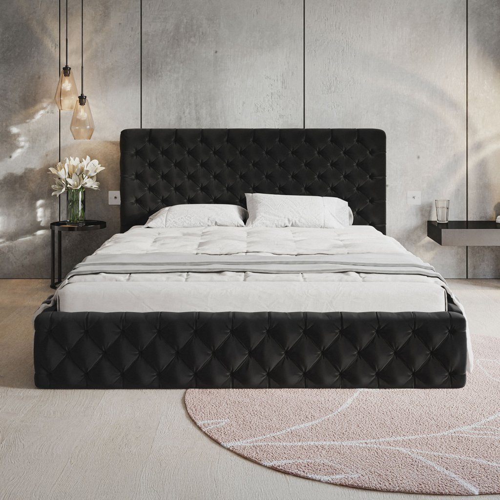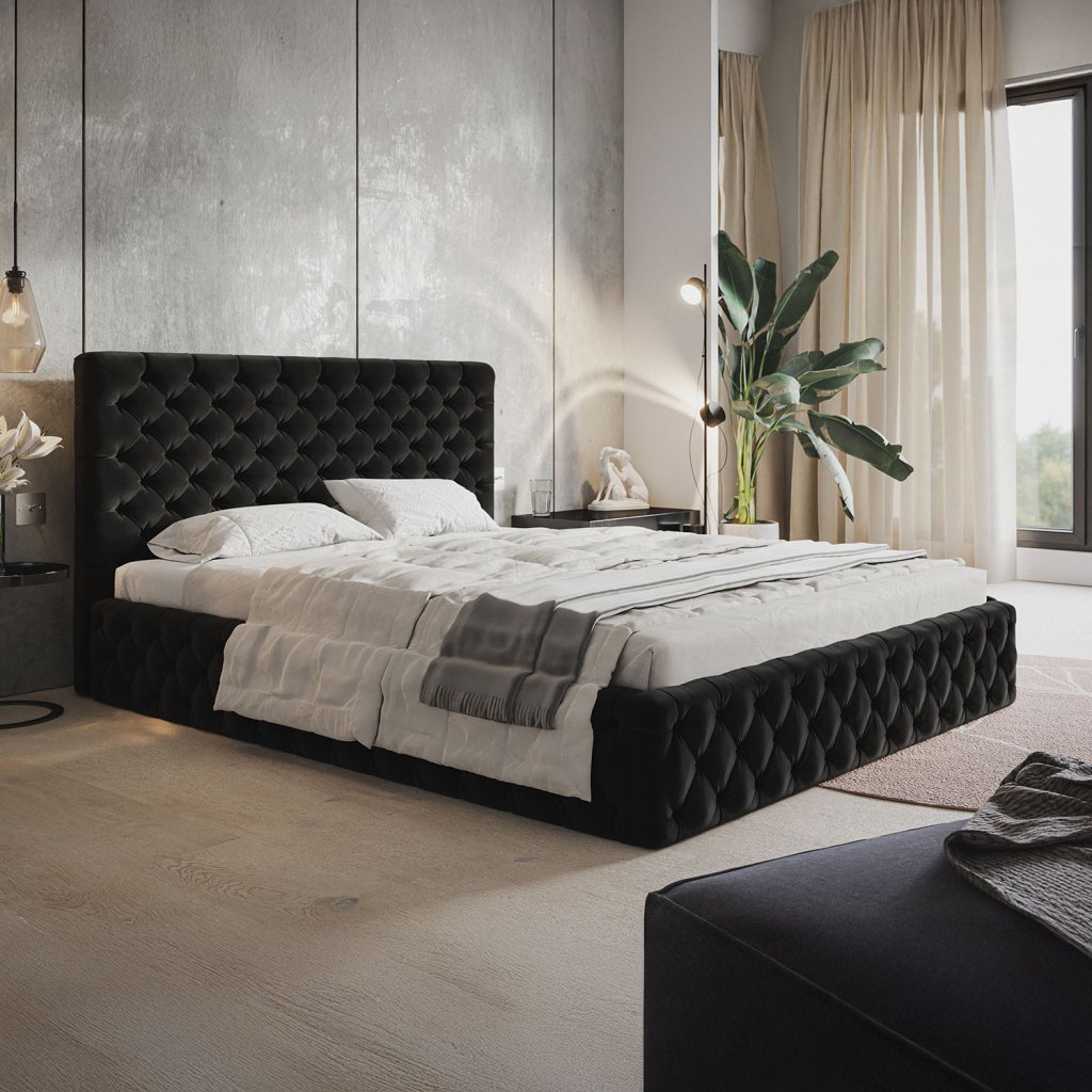 Dizajnová čalúnená posteľ KERA je skutočným stelesnením elegancie a luxusu. Vyznačuje sa bohato prešívaným čelom a rámom v štýle chesterfield, ktorý dodáva priestoru výnimočný charakter. Jej symetrický a opulentný vzhľad pôsobí noblesne z každého uhla, čím sa stáva dominantou každej modernej spálne. Praktický úložný priestor poskytuje dostatok miesta na uskladnenie posteľnej bielizne, zatiaľ čo kvalitná konštrukcia zabezpečuje stabilitu a dlhú životnosť. Možnosť výberu roštu vám umožňuje prispôsobiť si posteľ podľa vlastných potrieb.