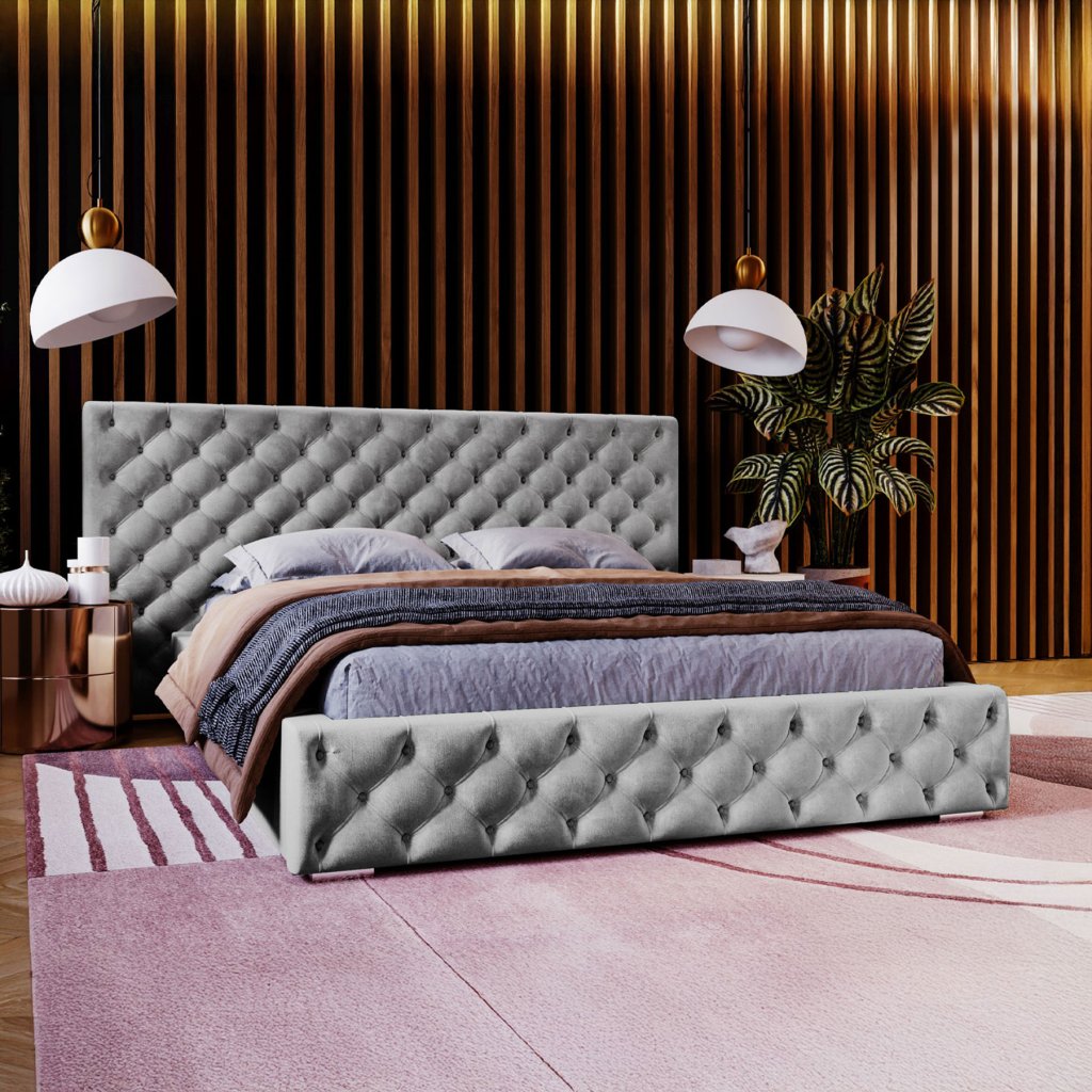 Neprehliadnutelná čalúnená posteľ MIRI v štýle chesterfield.