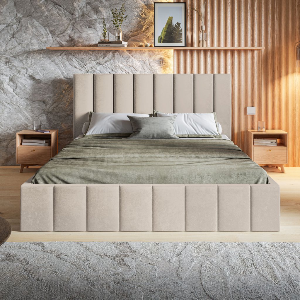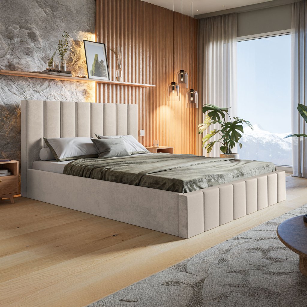 Dizajnová čalúnená posteľ RIJA vyniká svojím symetrickým vertikálnym čalúnením, ktoré jej dodáva harmonický a moderný vzhľad. Elegantná kombinácia jednoduchosti a výrazného štýlu robí z tejto postele výrazný prvok každej spálne. Kvalitná konštrukcia zabezpečuje stabilitu, zatiaľ čo priestranný úložný priestor poskytuje praktické riešenie pre uloženie posteľnej bielizne. RIJA ponúka aj možnosť výberu roštu podľa individuálnych potrieb, čo z nej robí ideálnu voľbu pre náročných zákazníkov.
