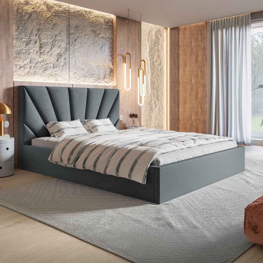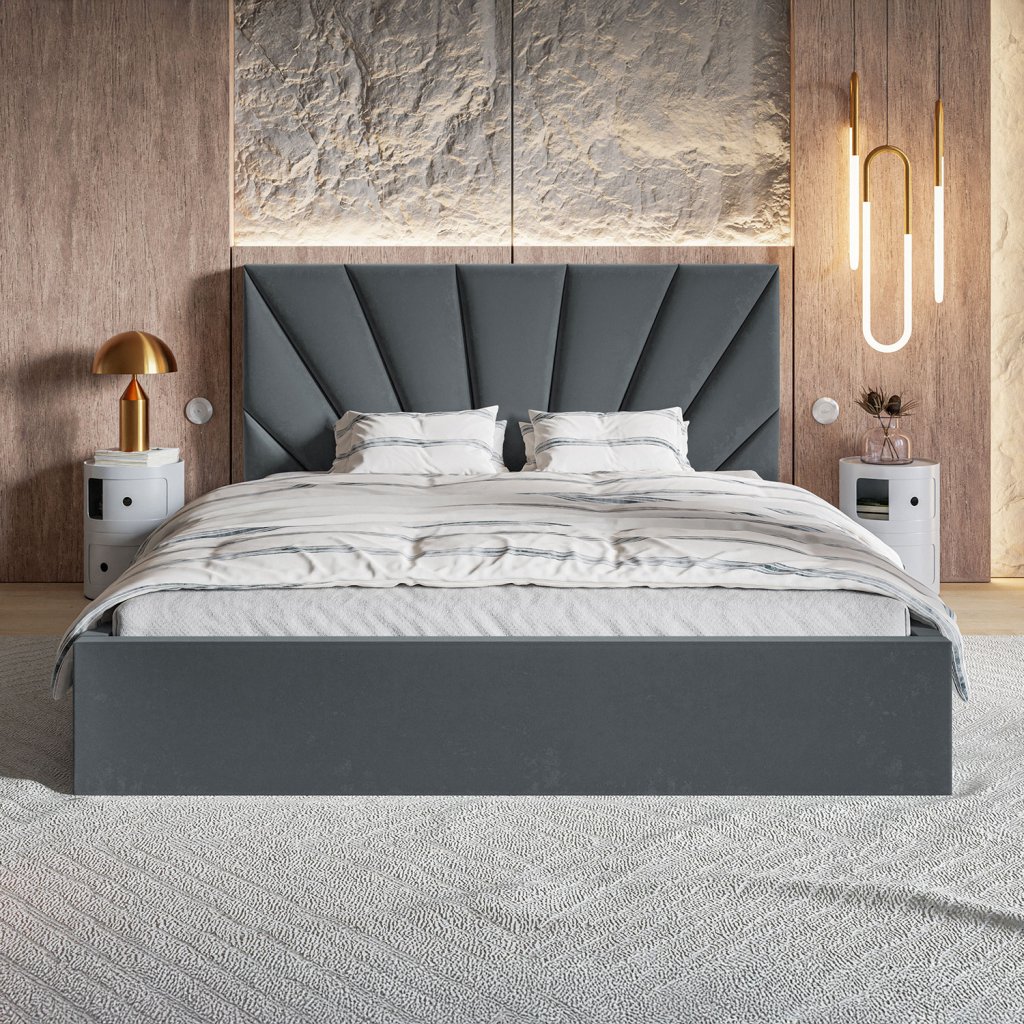 Posteľ SIRA upúta svojím moderným a výrazným dizajnom, ktorý kombinuje eleganciu s originálnymi detailmi. Jej vysoké čelo je vytvorené z panelov usporiadaných do efektu slnečných lúčov, čo dodáva miestnosti dynamický a unikátny vzhľad. V spodnej časti postele sa nachádza praktický úložný priestor, ktorý poskytuje dostatok miesta na uloženie posteľnej bielizne a iných vecí. Posteľ SIRA je skvelou voľbou pre tých, ktorí hľadajú štýlový a funkčný prvok do spálne.