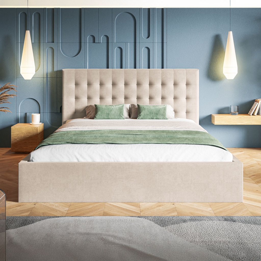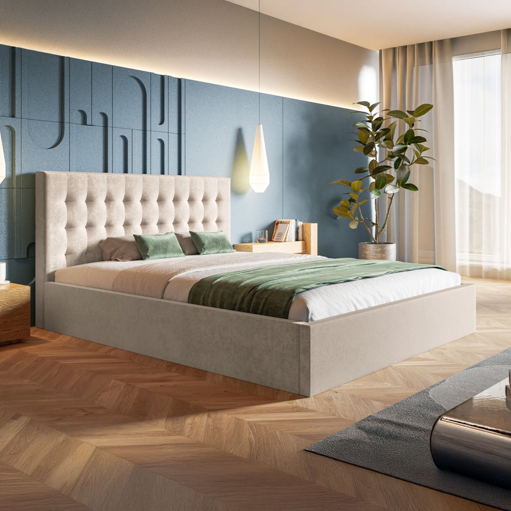 Čalúnená posteľ VEGA zaujme svojím elegantným a moderným dizajnom, ktorý krásne zapadne do každého interiéru. Jej vysoké čelo s výrazným prešívaním dodáva priestoru štýlový a luxusný nádych, zatiaľ čo čisté línie rámu podčiarkujú nadčasový vzhľad. Praktický úložný priestor v spodnej časti postele poskytuje dostatok miesta na uloženie lôžkovín či sezónnych vecí. Táto posteľ spája estetiku a funkčnosť, čím vytvára harmonické a pohodlné prostredie na odpočinok.