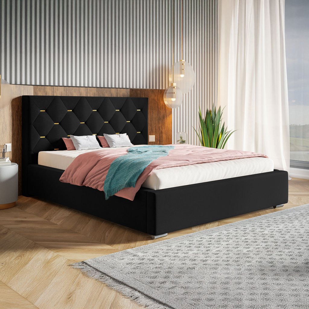 Čalúnená posteľ VERA zaujme štýlovým dizajnom a prešívaným čelom s dekoratívnymi prvkami, ktoré vnesú do spálne eleganciu a útulnosť. Vysoké čelo zabezpečuje pohodlie pri opretí počas čítania alebo oddychu. Praktický úložný priestor pod matracom ponúka ideálne miesto na odkladanie lôžkovín či iných vecí, pričom prístup k nemu je jednoduchý vďaka výklopnému mechanizmu. Na výber je drevený lamelový rošt alebo kovový rošt s piestami, podľa toho, čo vám viac vyhovuje. Posteľ VERA je skvelou voľbou pre tých, ktorí hľadajú spojenie moderného vzhľadu a každodennej funkčnosti.