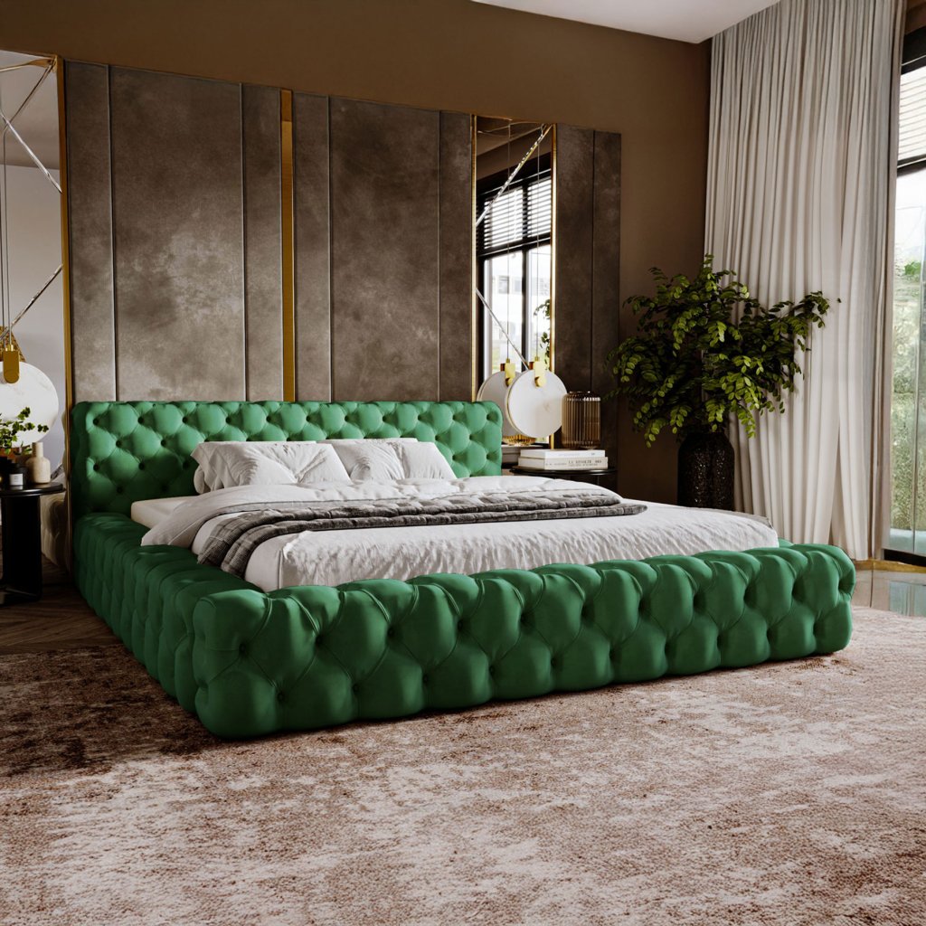 Čalúnená posteľ ZUZU v elegantnom štýle chesterfield.
